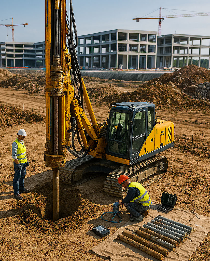 בדיקת חוזק לחיצה בלא כלוא בסלע – הערכת חוזק מקסימלי ללחיצה בלא כלוא של סלע רך עד קשה ויחס מאמץ-עיבור, הבדיקה (העמסה צירית) נערכת על מדגמי סלע שהוצאו מקידוחי ניסיון בעזרת מקדח גלעין.